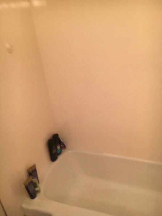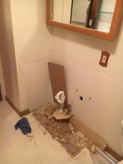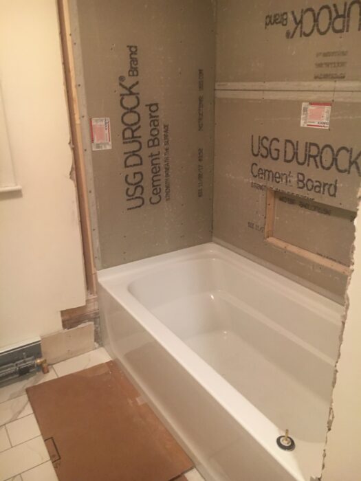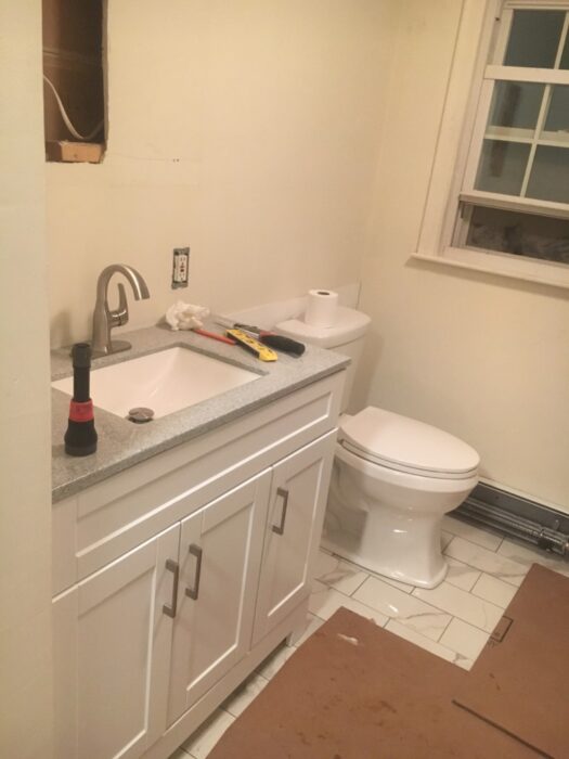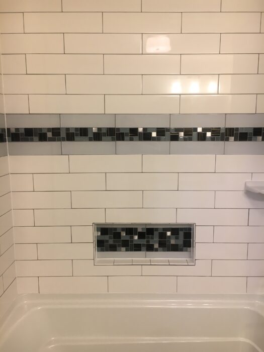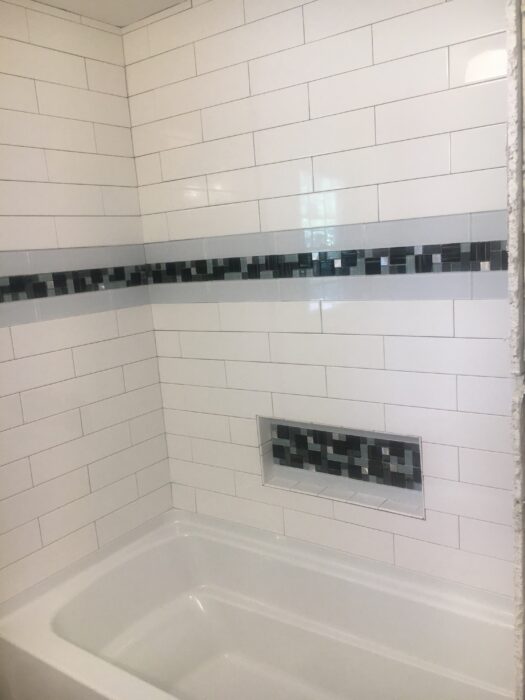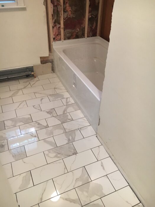 Work Performed: Removal of old vanity, cast iron tub, light fixtures, shower insert, and floors. Install new tile flooring, tub with plumbing adjustments, new vanity, new toilet and shower tiles. (Designed by BSD)
