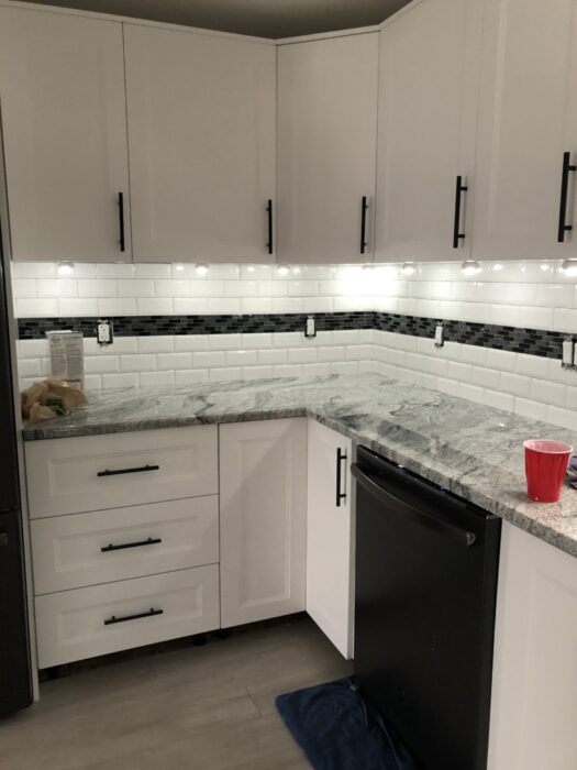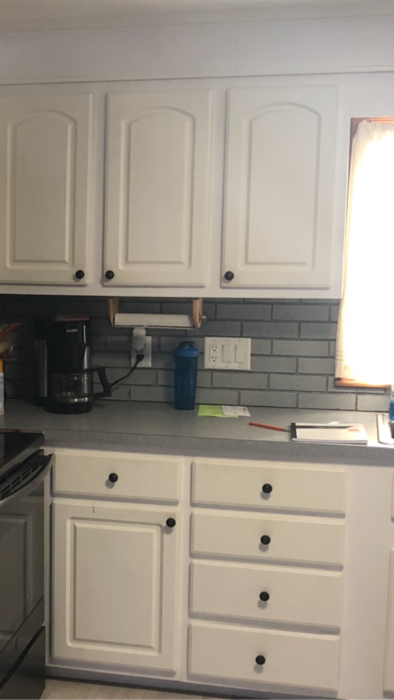 Work Performed: Took off the old brick backsplash which took the drywall with it, so I had to replace drywall. Then help come up with a design for new backsplash which I then installed.
