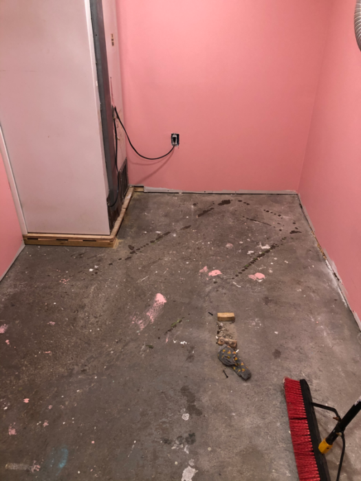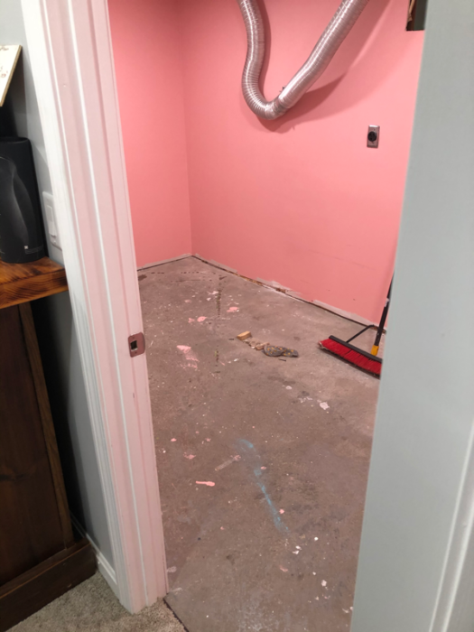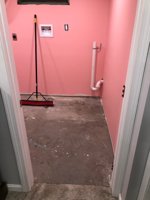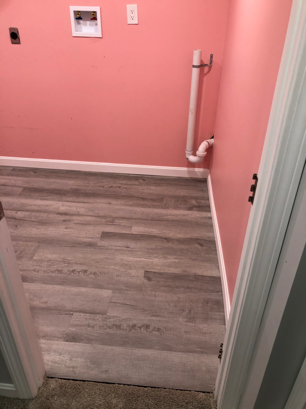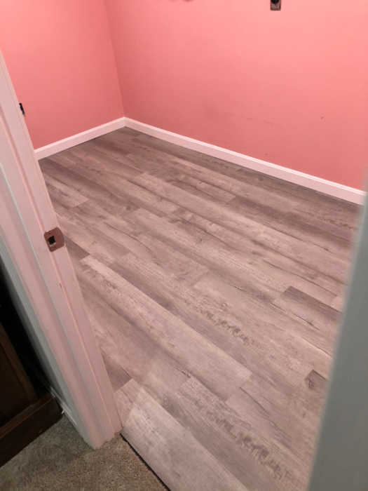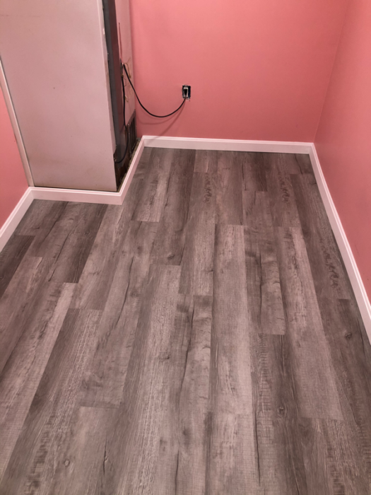 Project Requirements: Install underlayment, vinyl, and baseboard. Work Performed: Underlayment was installed followed by the vinyl flooring. Baseboard was cut to size, painted and installed. The nail holes were filled and the baseboard was caulked.